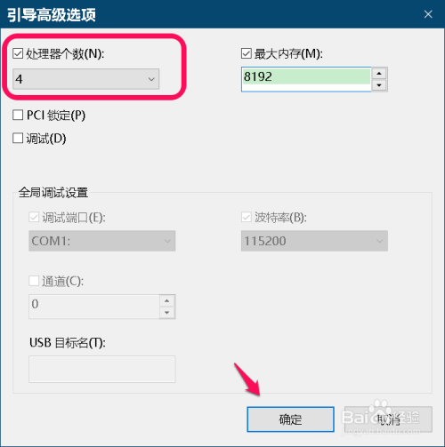在指导高级选项窗口,我们点击选择处置器个数为:4(按照CPU焦点数选择),再点击:确定;
