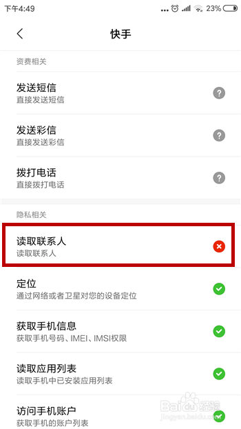 选择后返回到授权界面,可以看到读取联系人后的状况变为绿色的√,如许就开启了权限。