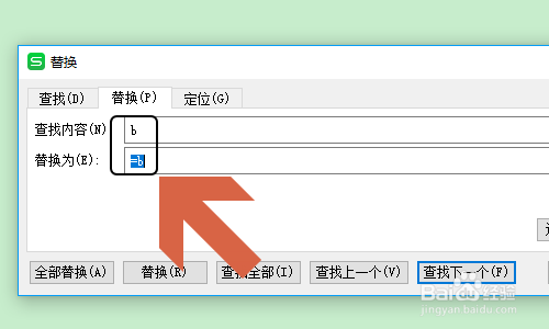 最后将所有这些表格选中,然后点击东西栏的“查找”-“替代”,然后在弹出的替代对话框,我们将查找内容“b”全数替代为“=b”;