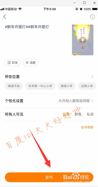 会主动添加“新年许愿灯”话题,可说点什么后发布,发布前别忘了点一下“存相册”,然后上传到抖音。