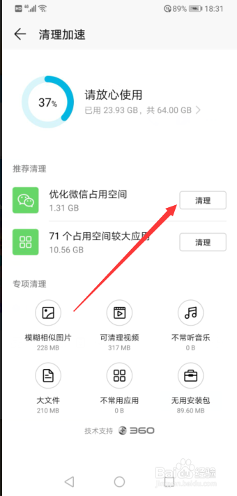 进入清理加快页面后我们需要点击清理微信空间和查看内存较年夜的软件也可以卸载