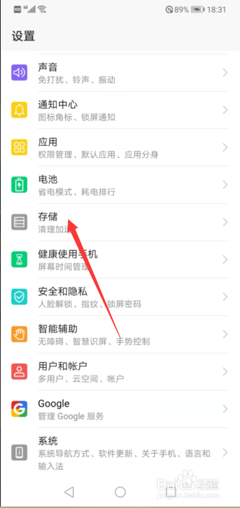 在设置中首先我们存储,下拉到中心部门就可以找到的存储功能,如图所示