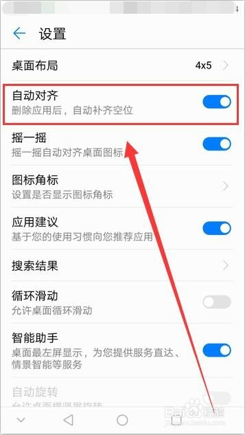 选择主动对齐选项,桌面上的图标就会主动对齐显示,当删除应用后,图标会主动补齐空位。