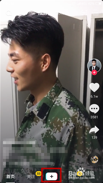 首先要知道这个视频是利用道具的,所以在抖音里点击【+】。
