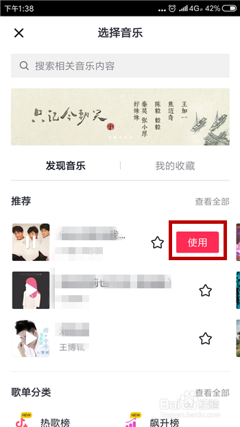 打开曲库后找一首音乐并点击,然后点击后方的【利用】选项。
