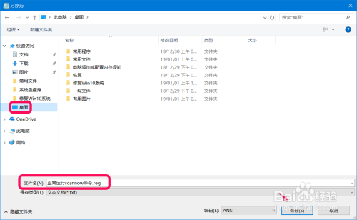 在另存为窗口中,先点击窗口左侧的【桌面】,在文件名(N)栏中输入:正常运行scannow号令.reg(也可所以其他名称),再点击:保留;