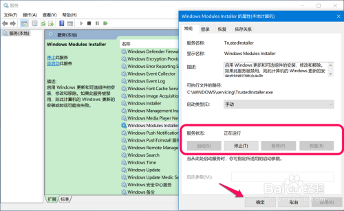 当 Windows Modules Installer 的办事状况为:正在运行时,点击:确定;