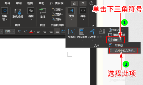 然后我们点击“对象”右侧的下三角符号,在其子项中单击“文件中的文字”,这时会弹窗“插入文件”对话窗。如图所示: