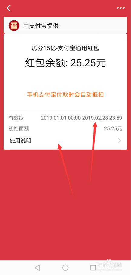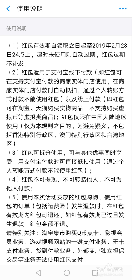 在付出宝瓜分15亿红包利用申明界面里可以看到具体的介绍红包的利用,如下图所示。