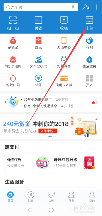 在付出宝首界面里直接点击右上角的【卡包】,如下图所示。