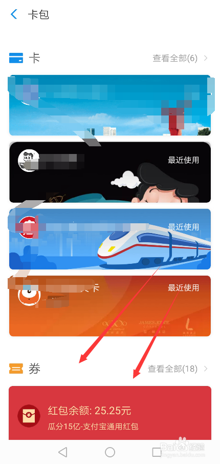 在付出宝卡包里的券下面就可以看到付出宝瓜分15亿红包,看不到直接点击券进入,如下图所示。