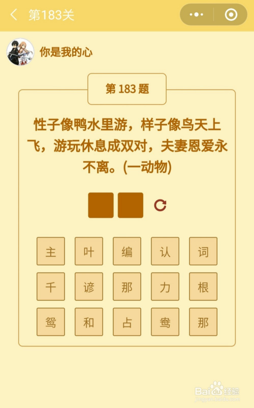 第183关谜底是鸳鸯。
