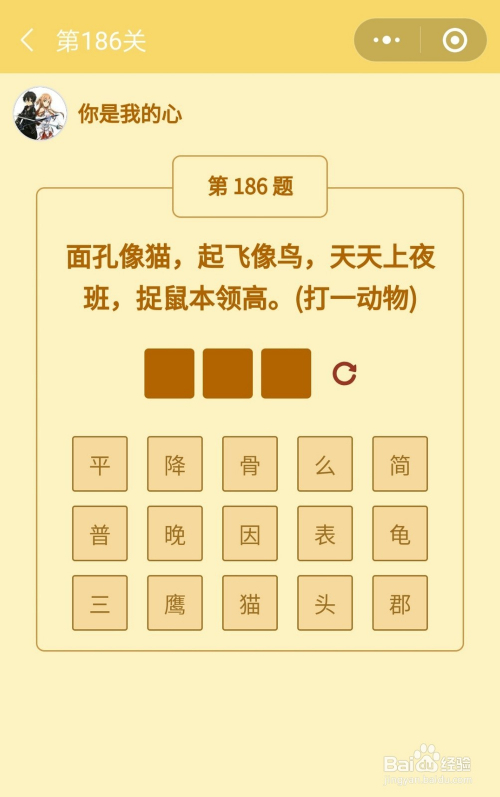 第186关谜底是猫头鹰。