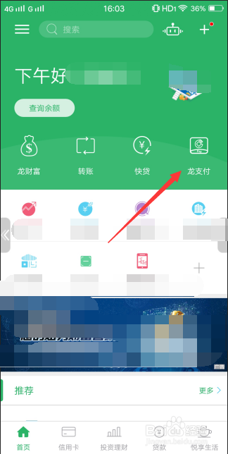 首先打开手机中已经下载安装好的手机扶植银行APP,登录本身的账号后,点击上方功能模块中的【龙付出】。
