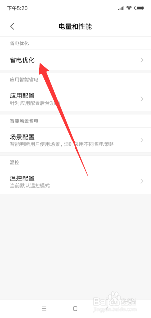 在电量和机能选项中,我们可以找到第一项省电优化,此时点击进入省电优化设置。