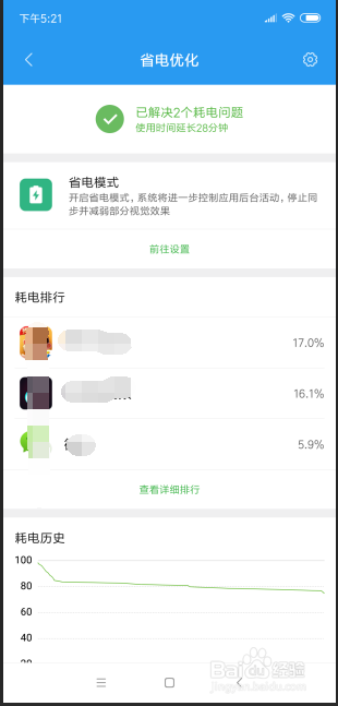 此时我们可以看到,已经解决了两个耗电问题,可以耽误手机利用时候,长达20八分钟如图所示,同时我们也可以开启省电模式。
