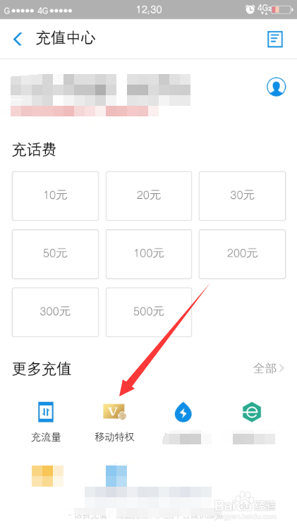 充值中间下更多充值中点移动特权。