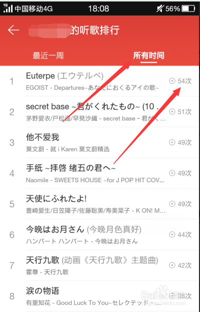 最后我们点击右上方的【所有时候】,就可以看到我们听歌次数最多排名啦