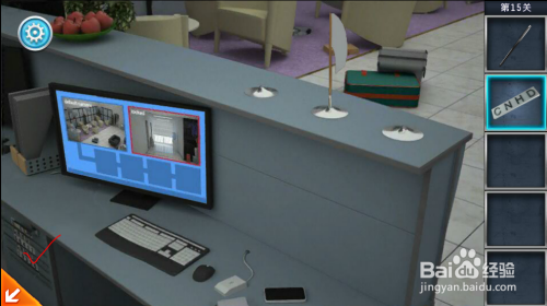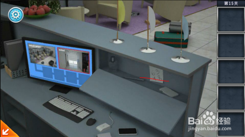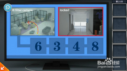把旗子插到吧台上的旗座上,黄色的在左面,蓝色的在右面。下面的盒子打开,获得密码6348。把密码输到电脑中,监控显示有通标的目的盆栽的脚印。
