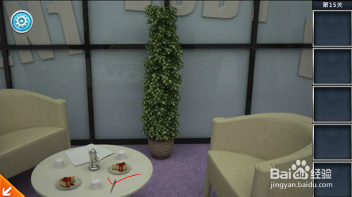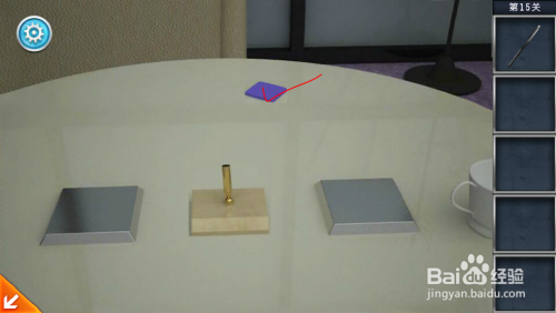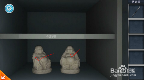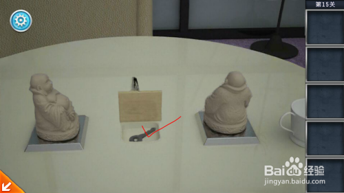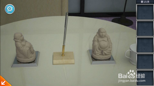 把佛像和钢笔放到左边圆桌上的笔架和底座上。之后,调整佛像的偏向,左边的佛像朝右,右边的佛像朝内,点击钢笔,获得钥匙。