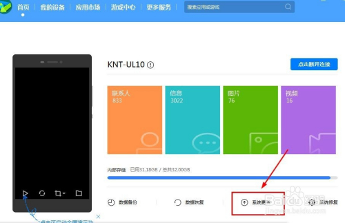 然后,用数据线将荣耀v8手机毗连到安装有手机助手的电脑上,并经由过程设置当作功让软件识别到手机,读取数据,再在软件本家儿界面中点击“系统更新”。
