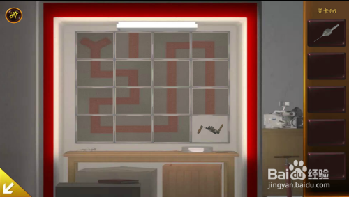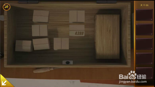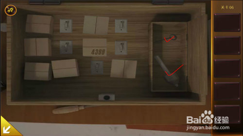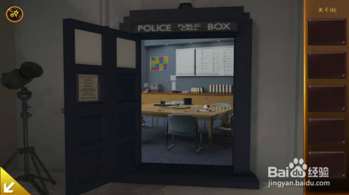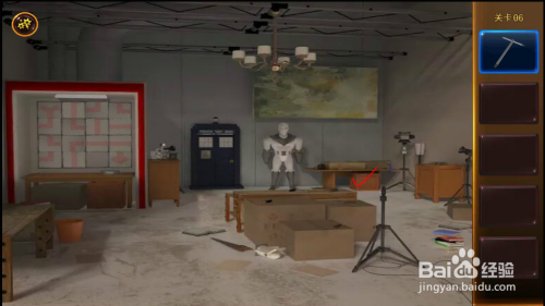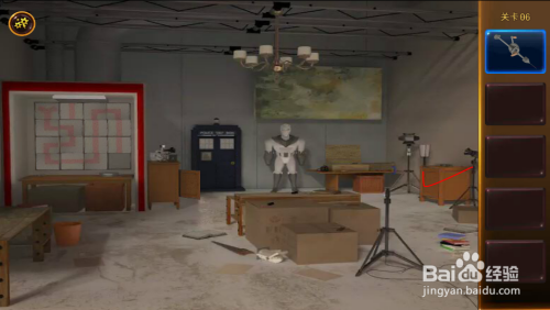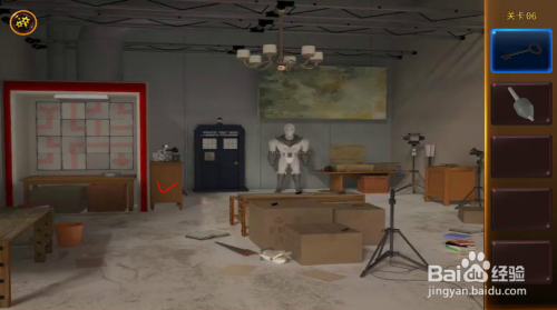 用T字架打开机械人右边桌子下的箱子。移开几个小纸盒,打开全数开关,右边小盒子打开,拿到钥匙和钻头。