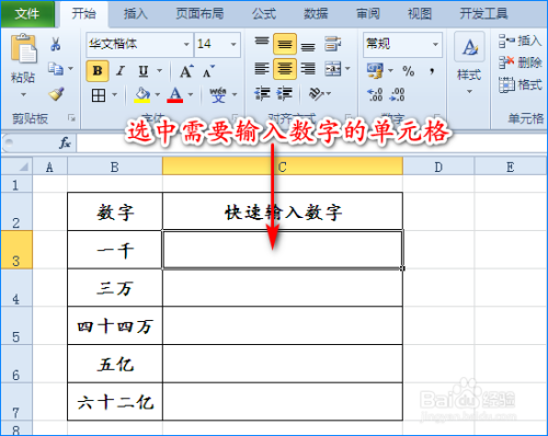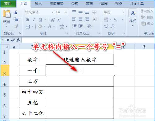 首先我们打开Excel表格,选中需要输入数字的单位格,并在单位格内输入一个等号”=“。如图所示: