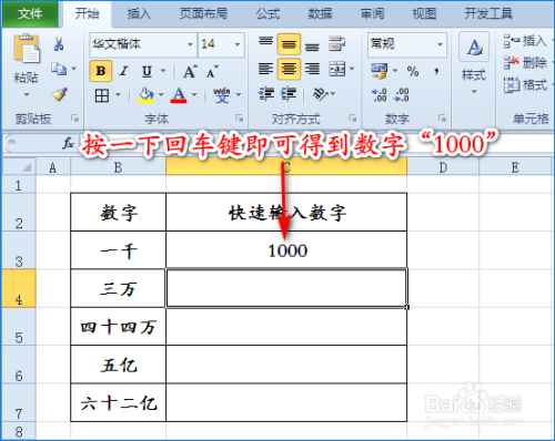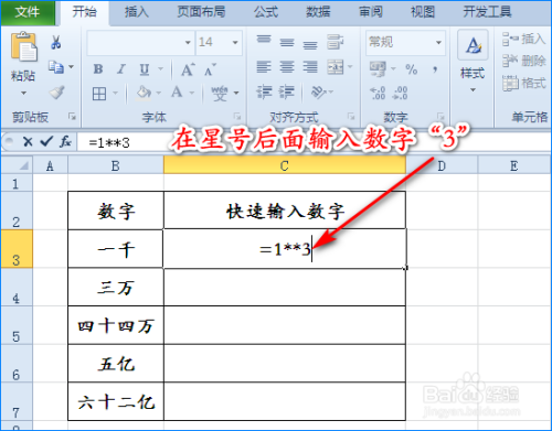 因为数字”1000“中包含了三个零(0),故我们只需在两个星号”**“后面输入数字”3“,最后按一下回车键即可获得数字”1000“。如图所示: