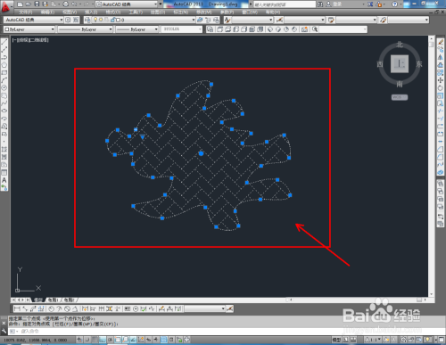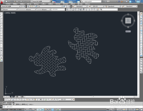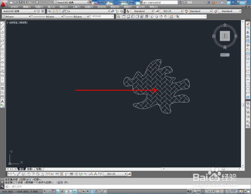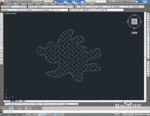 打开AutoCAD2013软件,点击【样条曲线】,在作图区域绘制一个曲线图案。点击【图案填充】,选择一种填充样式,对曲线图案进行填充(如图所示);