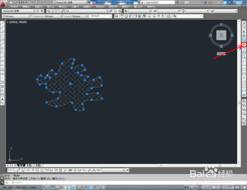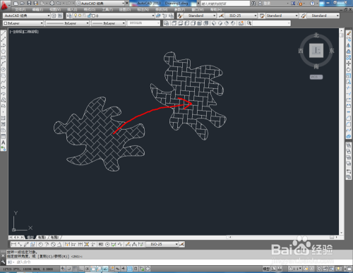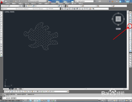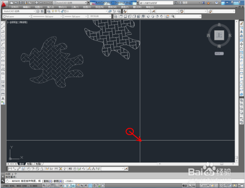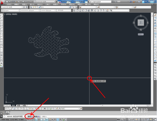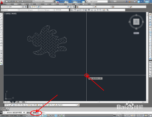 选中图案,点击右边东西栏中的【扭转东西】,鼠标点击图案的中间点(确定选中基点),点击下方号令栏中的【参照】,移动鼠标进行图案扭转移动(如图所示)。