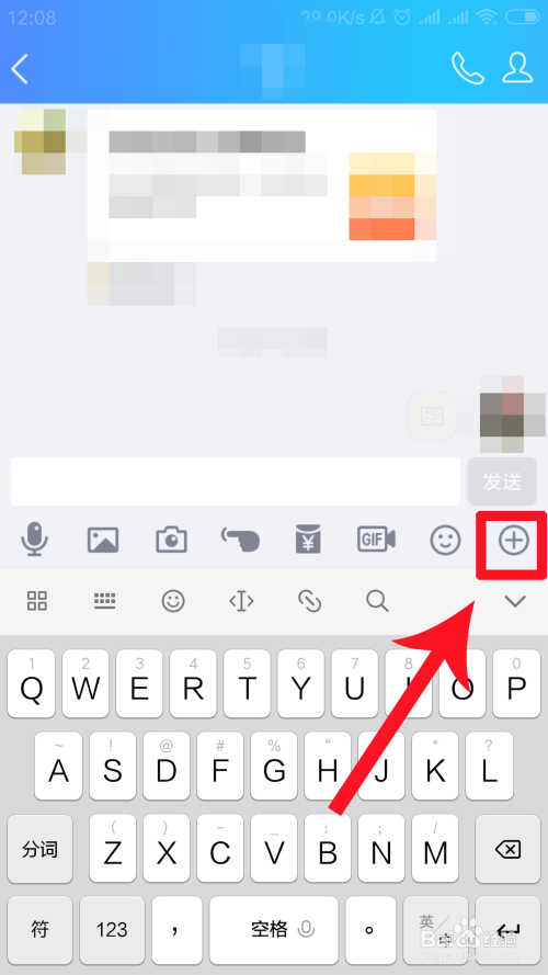 第二步,进入聊天界面之后,点击“右下方”如图“加号“。