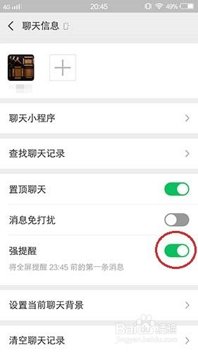 在【聊天信息】页面中,打开“强提醒”。