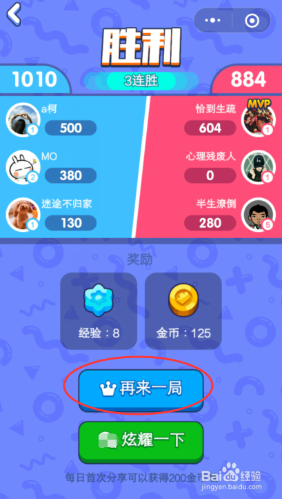 参赛战队分数展示,最终可获得经验和游戏金币,点击“再来一局”,可继续角逐。