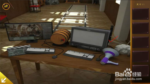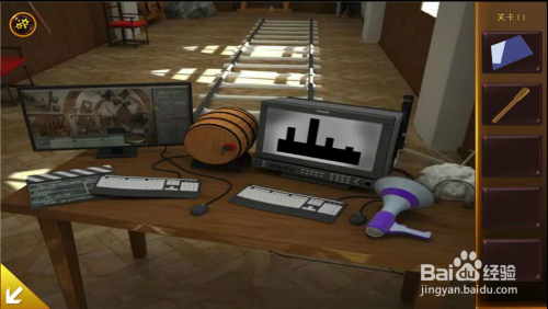 右边桌子上,打开DVD,看到木桶塞子位置提醒。