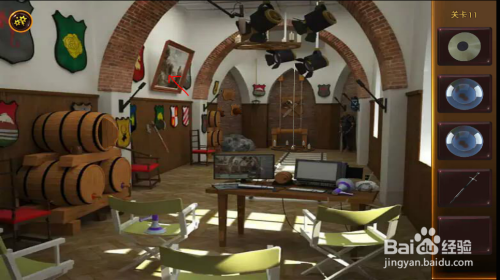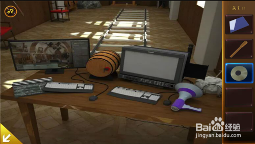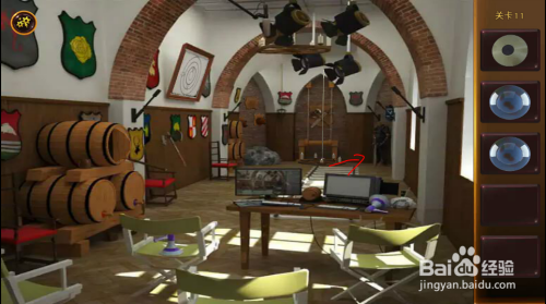 左边木桶处,拿到木棍。按照前面提醒,扭转木桶塞子的位置(先扭转下面两个,到位后,再扭转上面一个),打开木桶后,拿到光盘。
