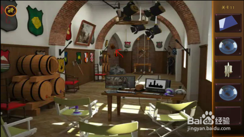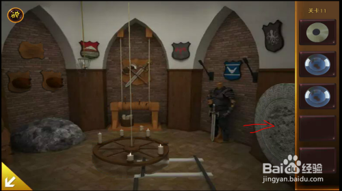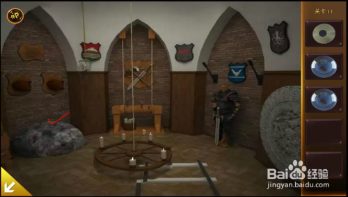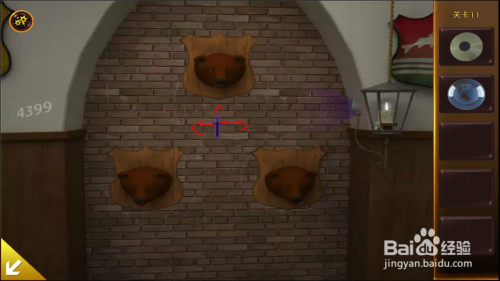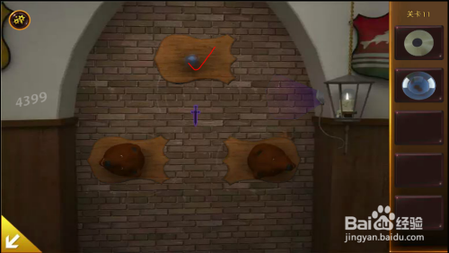 左边拱门上面,把蜡烛放入灯罩中,把卡片放在灯罩上,呈现提醒。按照提醒扭转兽头,拿到第三个球。