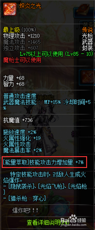 兵器保举“炽炎之光”(【能量萃取】技术进犯力增添量+7%),还可以选择以下装备“远洋每日光枪”(技术Lv+2)、“魔兽殛毙者”(技术Lv+2)。