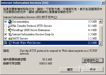 选中World Wide Web Service项目,单击具体数据按钮并单击。会弹出World Wide Web Service标的目的导窗口。
