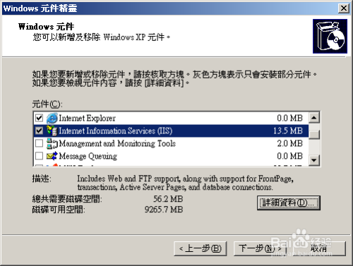 选中Internet Information Services(IIS)项目。然后单击具体数据按钮,会弹出IIS响导