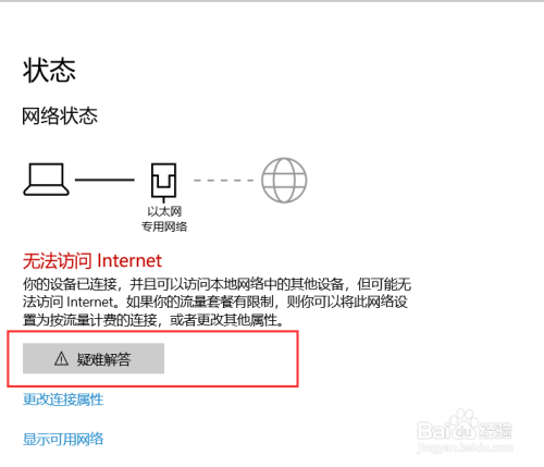 鄙人图中,收集毗连上面显示有一个“感慨号”,这申明此时无法拜候Internet收集,也就是说此刻无法上网,好比浏览网页、登录APP等。只有当这个图标没有感慨号的时辰就可以正常拜候收集。
