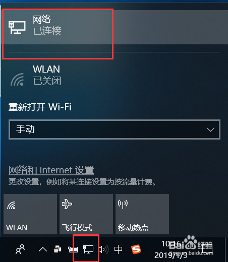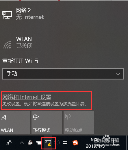 2.1 首先鼠标左键单击使命栏中的收集毗连图标,然后在弹出的界面上在单击“收集和Internet设置”。