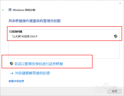 2.3 打开“疑难解答”收集诊断东西后,最后会弹出收集诊断的成果。如图已经找到问题,说“以太网为启用DHCP”,此时我们利用鼠标左键单击“测验考试以办理员身份进行这些修复”