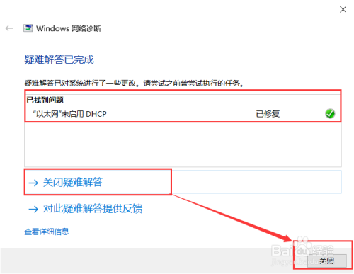 在应用了修复之后,也会找到问题,同时最后也会解决。然后利用鼠标左键单击“封闭疑难解答”或者“封闭”