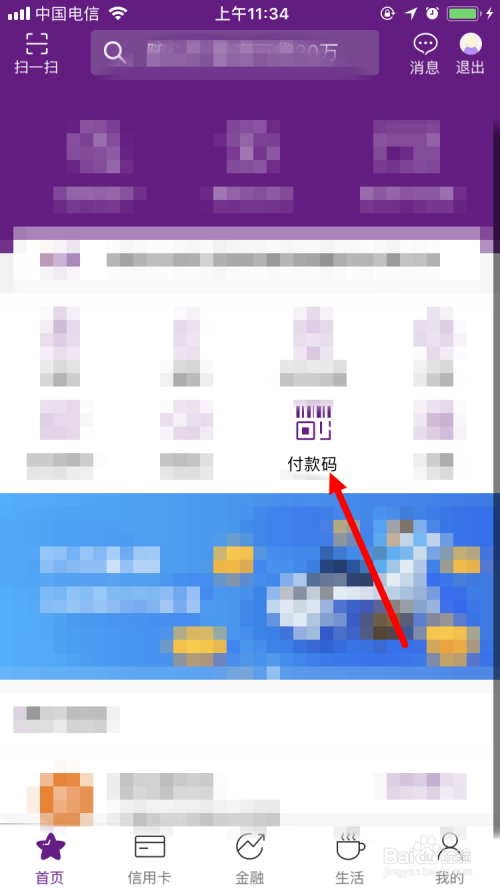 首先在手机上打开并登录光年夜银行App,并在首页面点击 付条目码 。