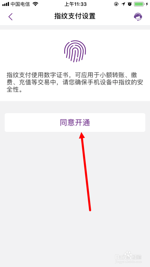 进入 指纹付出设置 页面,点击 赞成开通 。