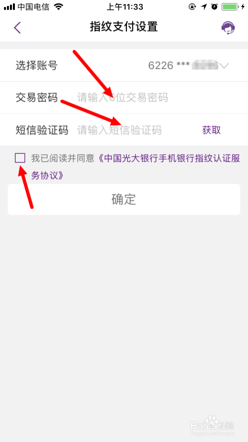 鄙人一个页面输入 买卖密码 、 验证码 而且勾选 我已阅读并赞成《中国光年夜银行手机银行指纹认证办事和谈》。