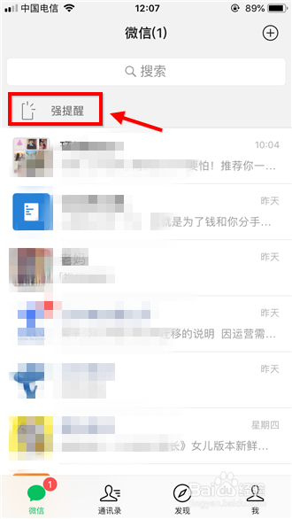 回到对话列表,这时辰在界面最上方多出强提醒一项, 点击可查看人员名单。