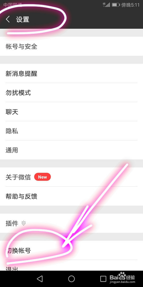 我们这时可以看到微信应用的设置页面及页面中的内容选项,我们选择切换账号;