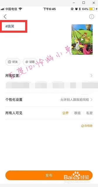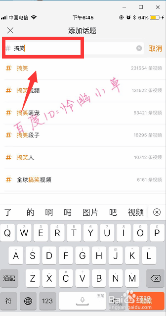 在搜索框内输入本身想要添加的话题,好比这里输入“搞笑”,下面会有良多相关话题可供选择。