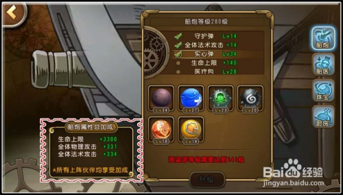 船炮附加属性包罗生命值、物攻和法攻3项。在280级时,其附加属性如下图所示: